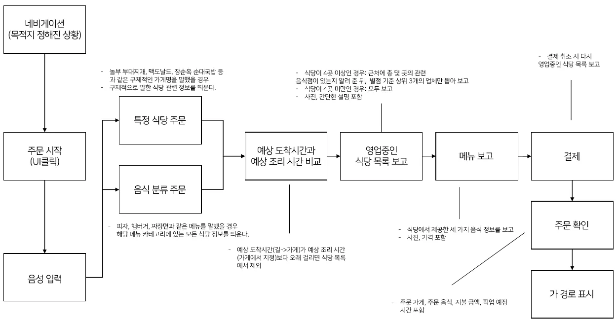 사용자가 내비게이션 앱에서 목적지를 설정하는 시점에 목적지 부근의 가게에 order 하고, 도착시간에 맞춰 조리된 음식을 Drive-thru pick-up 하도록 돕는 서비스